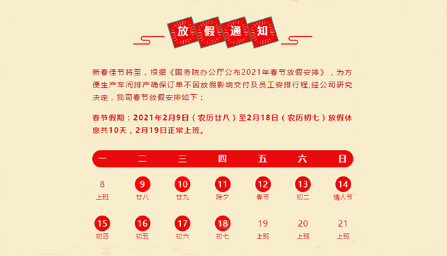 春節(jié)的腳步臨近,根據(jù)《國務院辦公廳公布2021年春節(jié)放假安排》,結合我司的具體狀況,方便生產車間排產確保訂單不因放假影響交付,經公司研究決定,我司春節(jié)放假安排如下:
